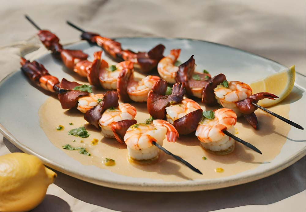 - Placez les brochettes sur la plancha et faites-les cuire pendant environ 3-4 minutes de chaque côté, jusqu'à ce que les crevettes soient roses et le chorizo légèrement grillé.