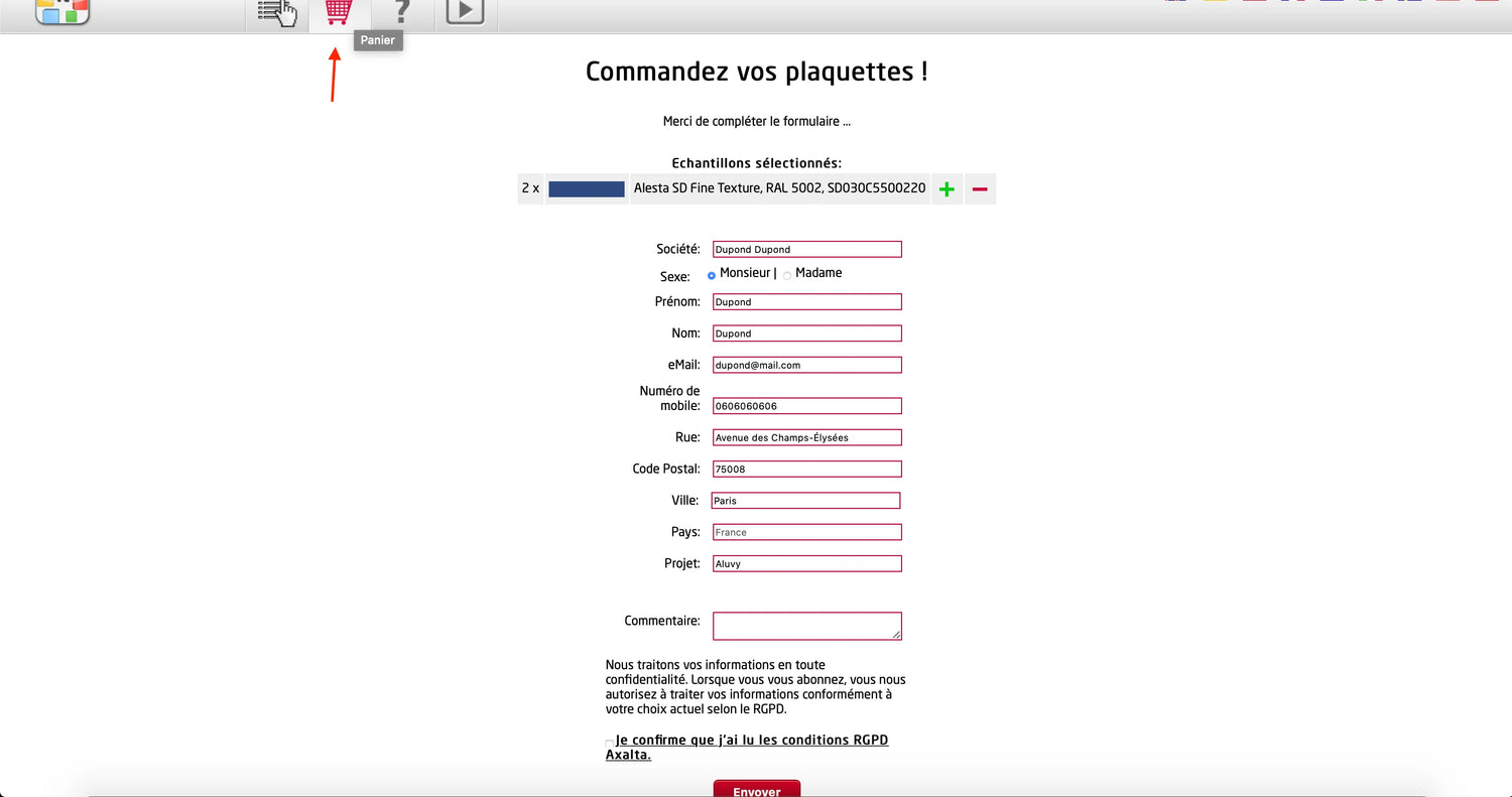 Répétez les étapes 1 à 4 pour ajouter jusqu'à 5 plaques puis cliquez dans le menu sur l'icône “Panier” (en haut à droite) pour finaliser la commande. Quand votre commande est complète, cliquez sur "Vérifier votre demande".