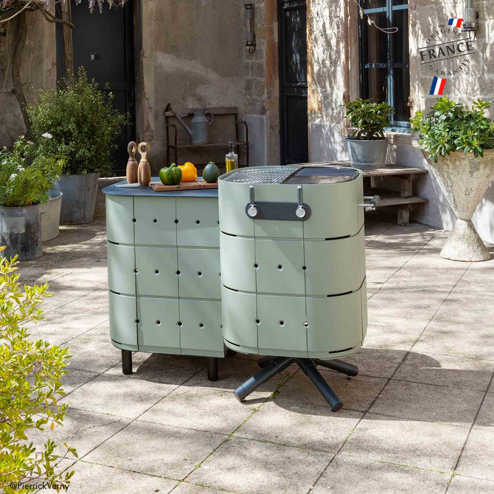 En 2022, ALUVY et Cécile s’associent pour créer une collaboration unique et à leur image : audacieuse, épurée et singulière ! Le choix de Cécile pour la couleur de JEAN, le meuble pour barbecue, s’est porté sur la jolie couleur "Ciment", un gris parfaitement subtil. C'est une couleur d’été, qu'elle utilise en décoration intérieure. JEAN, c’est le nouveau copain inséparable de MARCEL et LULU. Grâce à lui, vous pouvez transformer votre LULU ou MARCEL en véritable cuisine d’extérieur, parfaitement fonctionnelle. Avec JEAN, tout est possible : accolé d’un côté ou de l’autre de son barbecue (ou des deux), en fonction des envies, JEAN s’utilise comme plan de travail, pour préparer ses recettes et disposer de tout le nécessaire à portée de main. Le meuble offre également un bel espace de rangement pour ses couverts et ustensiles, sa bouteille de gaz, sa vaisselle ou encore épices et aliments : praticité et convivialité assurées, sans dénaturer l’extérieur ! JEAN est certifié Origine France Garantie.