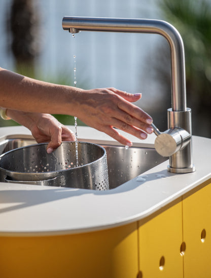 Découvrez JEAN avec évier (très belle contenance 40x40x20 cm (L x l x P)et mitigeur intégré), la solution simple et pratique pour faciliter vos activités en plein air.