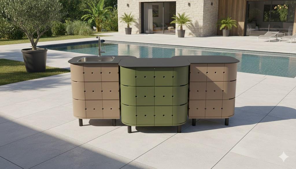 JEAN gauche option évier, GABY en meuble central et JEAN droit en meuble de rangement, un élégant trio de 2m50 qui vous permet d'accueillir votre propre plancha ou four à pizza sur nos plans de travail en aluminium thermolaqués. Nettoyage facile et résistance aux intempéries, vous pourrez facilement vous réunir autour de notre trio à n'importe quel moment de l'année. Un ensemble qui s'installe où vous le souhaitez pour créer un espace convivial et accueillant. Choisissez l'option évier à raccorder sur une arrivée d'eau existante ou sur un tuyau d'arrosage. Vous pouvez également intégrer un frigo dans notre meuble GABY ou JEAN droit et imaginer la cuisine qui vous ressemble.